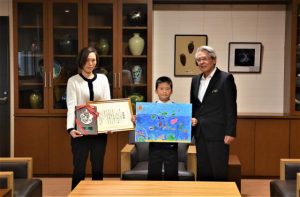 離島フェア2022絵画コンクールの表彰伝達式が27日、市役所で行われた。宮古島の青い海を描いた作品で優秀賞に選ばれた久松小学校1年の富山瑛仁君に座喜味一幸市長から表彰状が伝達された。