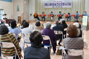 舞台発表の部には7団体が出演した。琴、ギター、詩吟、歌、フラ、オカリナと活動の内容は多種多様。ゆいみなぁに通い、楽しみながら活動してきた成果をそれぞれ笑顔で出し切っていた。