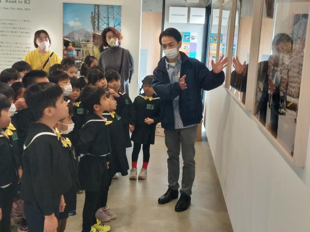 PALI GALLERY(パリ・ギャラリー、平良下里)で30日、子供たちを招いた「こどもギャラリー」があった。招かれたのは、はなぞのこどもえんの5歳児クラス24人で、現在開催中の写真家・石川直樹さんの個展「Road to K2」を鑑賞し、写真で登山を疑似体験した。