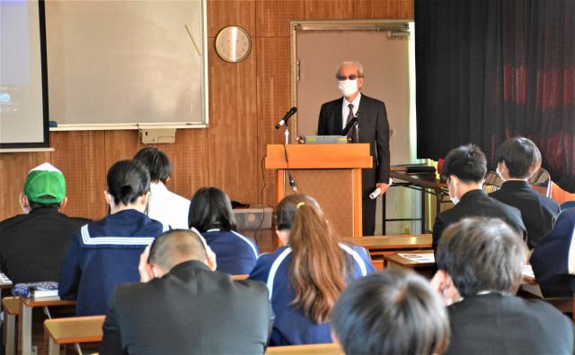 宮古高校の卒業生組織である南秀同窓会(安谷屋政秀会長)による講演会「語り継ぐ南秀魂 貴方は『命の水』地下水を守れますか?」が31日、同校で全校生徒を対象に開催された。同校25期生で医学博士の友利直樹さんが講師を務めた。友利さんは「宮古島の地下水を守るため、地下水汚染の解決方法を考え命の水を守るための強い決意と実行力が必要だ」と生徒たちに伝えた。