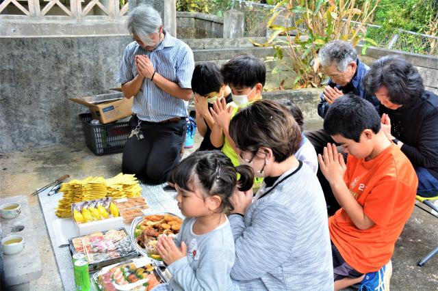 子ども7人、孫16人、ひ孫26人、やしゃご20数人がいる奥平シゲ子さん(93)は「仕事の都合などで、みんなが同じ時間に集まることは難しいが、子や孫たちと墓参りできた。先祖から受け継いだ手順を守ってお祈りした。夜は家にみんな集まるので楽しく過ごしたい」と話した。