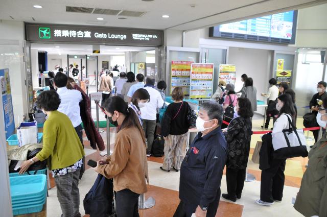 先祖を供養する伝統行事「旧十六日祭(ジュウルクニツ)」を宮古島で過ごした帰省者らのUターンラッシュが7日、ピークを迎えた。宮古空港の保安検査場では搭乗待合室に入ろうとチェックを受ける帰省客、観光客らで長い列ができた。