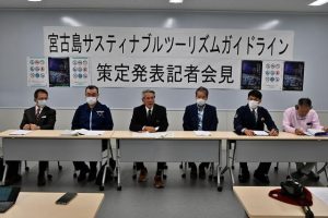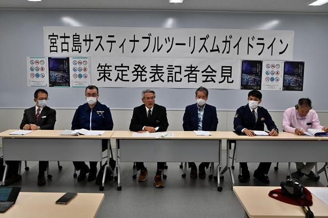 持続的な宮古島観光の実現を目指し、昨年5月に発足した「宮古島サスティナブルツーリズム連絡会」のガイドライン策定発表記者会見が8日、市役所で行われた。会見では座喜味一幸市長ら関係機関の代表が、子々孫々まで島の魅力を維持していくために官民一体となってその内容に取り組むことや、島人と旅人、事業者に対して、掲げた約束事を示しながら理解と協力を求めた。