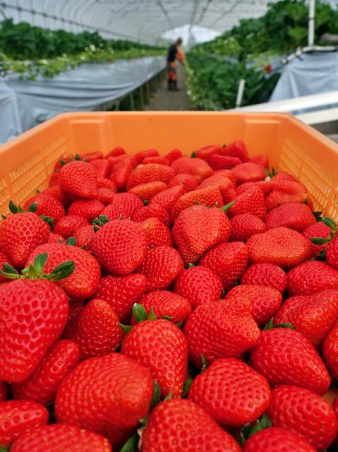 上野新里にある「あまいの大好き!農園」(平良繁和園長)では、完熟した真っ赤なイチゴの収穫が本格化している。8日もスタッフが大玉のイチゴの朝採りと出荷作業に追われていた。
