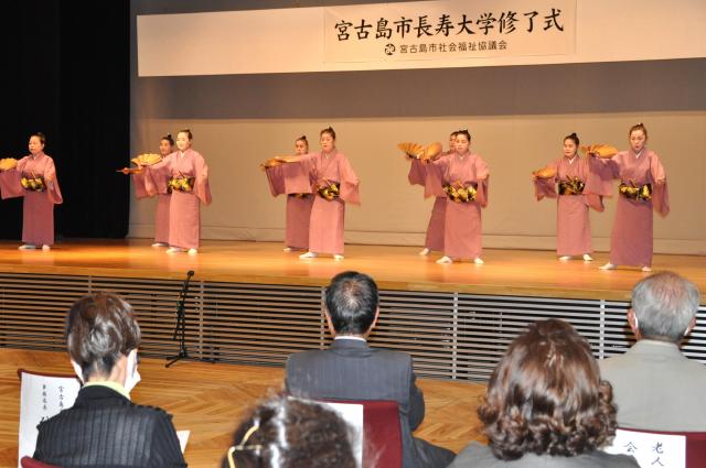 2022年度長寿大学の修了式(主催・市社会福祉協議会)が10日、市未来創造センター多目的ホールで行われた。琉球舞踊や合唱、三線など計21講座で学んだ受講生や講師らが出席。7カ月間の受講を振り返りながら、人生の生きがいにつなげていくことを参加者全員で確認した。吸収した技術など、これまでの成果を舞台で発表し仲間たちから大きな拍手を受けた。