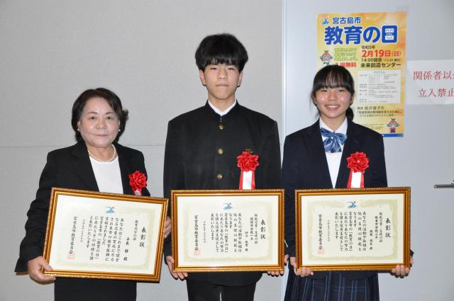 教育の日表彰では、日ごろの活動や努力が認められて西銘結衣さん(城東中3年)と砂川琉聖さん(狩俣中1年)が模範児童生徒、教育行政に協力した平良静さん(文溪堂代理店)が教育功労者としてそれぞれ表彰された。
