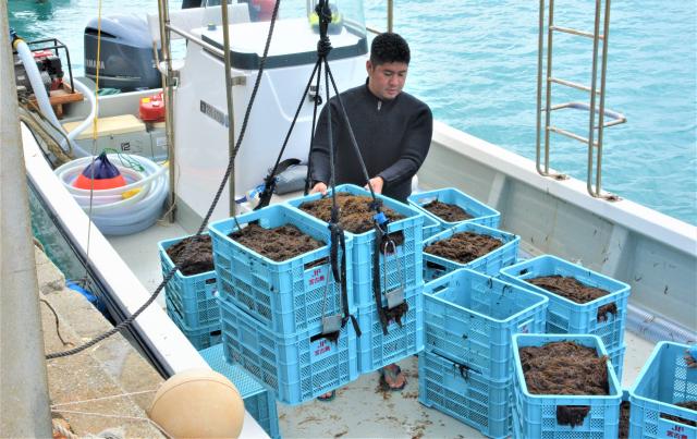 大浦湾で養殖されているモズクの収穫が23日、始まった。宮古島漁協に所属する西原モズク生産グループの池田昭幸さんが太モズク1・2トンを初収穫した。初収穫を終えた池田さんは「今期は昨年の長雨や日照不足などの影響で、収穫量は減るのではないか」と厳しい顔だった。モズクの収穫は狩俣地区でも始まっている。