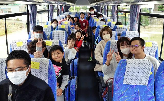 バスの中でもみんなの笑顔が広がった親子バスツアー=25日、伊良部島