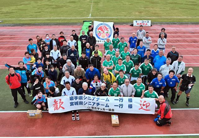 岩手県と宮城県のシニアサッカー交流団チームを招いた「2022年度宮古島シニアサッカー冬季大会」(主催・宮古サッカー協会シニア委員会)が25日、市陸上競技場で開催された。宮古島のシニアチームと宮古高校女子サッカーチームが、東北2県のシニアチームと競技を通して笑顔の交流を深めた。