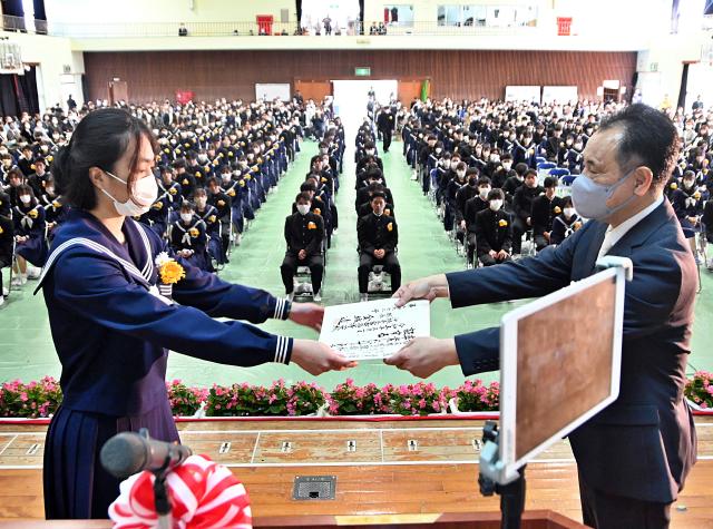 送辞で生徒会長の根間蒼葉さんは「今後、迷い立ち止まった時には(高校生活で)新型コロナと闘い、打ち勝った強い自分を信じてほしい。私たちも先輩たちが築き上げてきた伝統を守り、さらに磨きを掛けていきたい」と述べた。