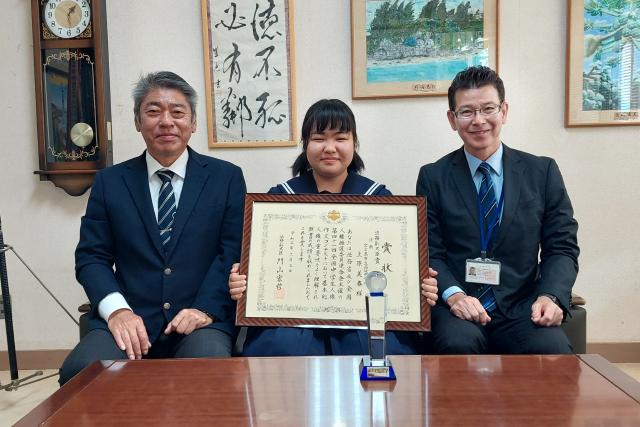 法務副大臣賞を伝達/上原さん(西辺3年)全国4位相当