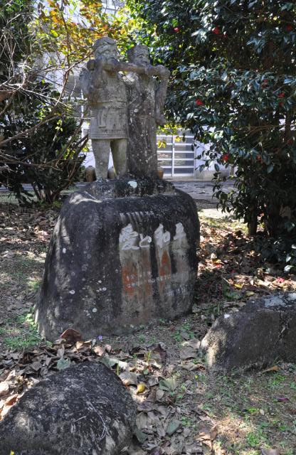 石像は台湾牡丹郷にある記念公園の石像のレプリカで、台座を含めた高さは約160㌢。琉球風の衣装とパイワン族の衣装を着た若者が肩を組み、二つの杯(さかずき)がつながった「連結杯」で酒を酌み交わしている。