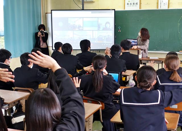鏡原中学校(濱川成共校長)のオンライン交流学習が14日、同校で行われた。同校の1年生41人が栃木県高根沢町立北高根沢中学校の生徒と、それぞれの地域の魅力や学習テーマなどを通して交流を深めた。