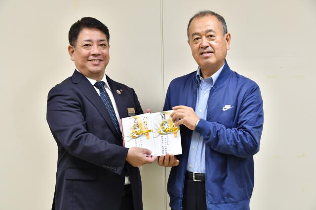 りゅうぎんユイマール助成会は15日、今春、高校を卒業した漲水学園の生徒2人に助成金を贈った。同行宮古支店で贈呈式が行われ、新垣盛志郎支店長が同園の砂川繁信園長に手渡した。