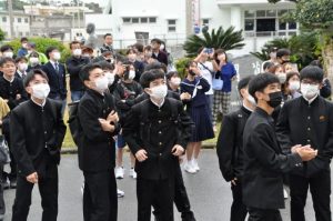 宮古高校(金城透校長)の合格発表は、正面玄関付近で行われた。一般入試では文理探究科53人、普通科128人の計181人が合格。合格者の受験番号が明記されたボードが午前9時に掲示された。校内には合格した生徒や保護者たちの笑顔があふれていた。
