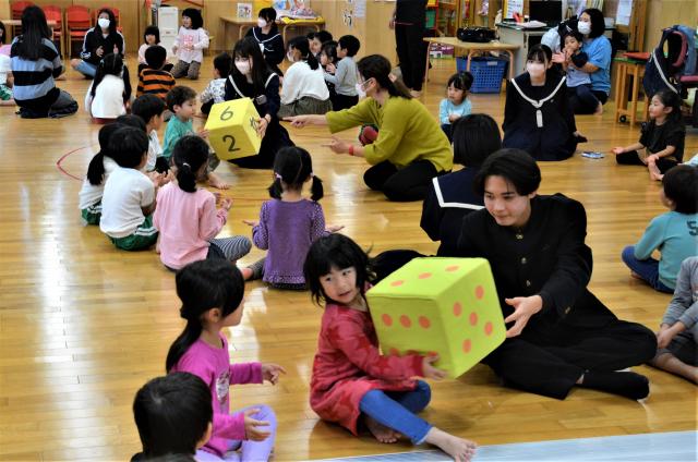 ふたば保育園(長田克子園長)は14日、園児と同園を卒園した生徒が交流する「ふたば会」を開いた。園児は先輩に当たる生徒たちとゲームをしたり、ダンスをしたりして楽しい時間を過ごした。