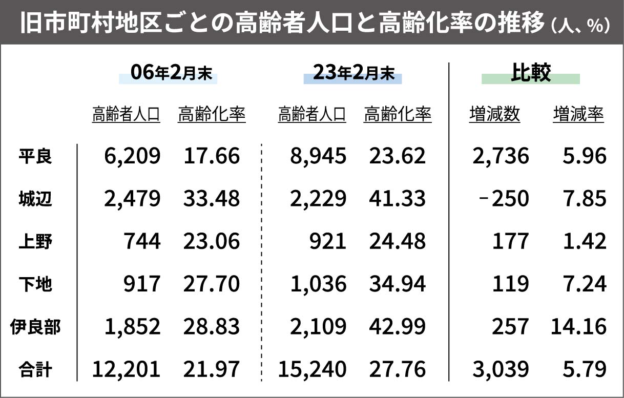 高齢化率が最も低かったのは平良の23・62%だが、17年前と比較して高齢化率の増加幅が最も少なかったのは上野で、平良が5・96ポイント増となっているのに対し、上野は1・42ポイントの増にとどまっている。
