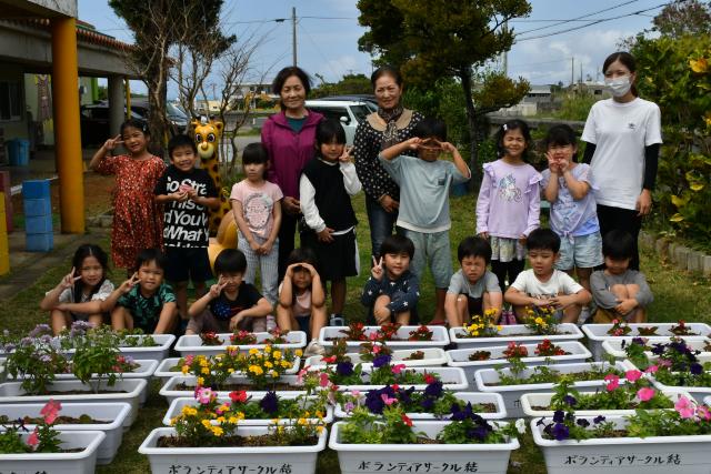 ボランティアサークル結(福島典子代表)は16日、伊良部こども園(横田千春園長)に花のプランター30鉢を贈った。花いっぱい運動と地域貢献の一環。贈呈式が同園で行われ、花を受け取った園児たちは「ありがとうございます」と礼を述べた。