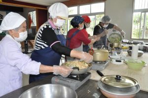 「通いの場吉野」主催の料理教室が24日、城辺の吉野公民館で行われた。地域に住む65歳以上約10人が参加し、簡単に作れて栄養価が高く常備菜にできる料理に挑戦した。味をみるために試食もして「自分の家でも作ってみよう」などと会話を弾ませた。
