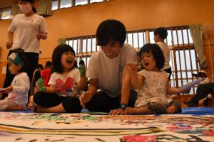 第1回宮古島アートデー(主催・「笑顔をつなぐプロジェクトチーム「COCO」)が25日、ひらら児童館で開催された。親子連れら約100人が参加。手や足を使って絵を描くなど、自由に表現することを体感した。