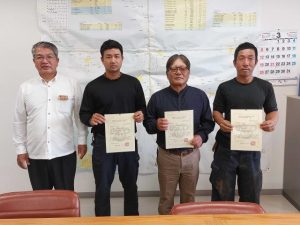 県によるエコファーマー認定証の伝達式が27日、宮古農林水産振興センターで行われた。カボチャで今回、認定を受けた森上聡さん、再認定を受けた大嶺ファーム(マンゴー)、垣花充さん(ニラ)に砂川喜信センター長から県知事の認定証が手渡された。