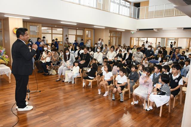 砂川幼稚園と砂川保育所を統合させた施設として誕生した幼保連携型認定こども園のいけむらこども園(松元司園長)が1日、開園の日を迎え、入園式が行われた。0歳児から5歳児まで計53人の園児が登園し、真新しい園舎でのこども園生活をスタートさせた。