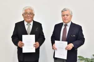 市政策参与への委嘱状交付式が3日、市役所行われ、座喜味一幸市長が3月31日で任期満了を迎えた新里聡氏(71)と池間作一氏(70)に再び政策参与を委嘱した座喜味市長は「引き受けていただきありがとう。公共施設等の利活用など課題があり、市民の声を届けてほしい」などと述べ、市民目線で、市の課題解決に取り組んでほしいと期待を寄せた。2人の任期は1日から来年3月31日まで。