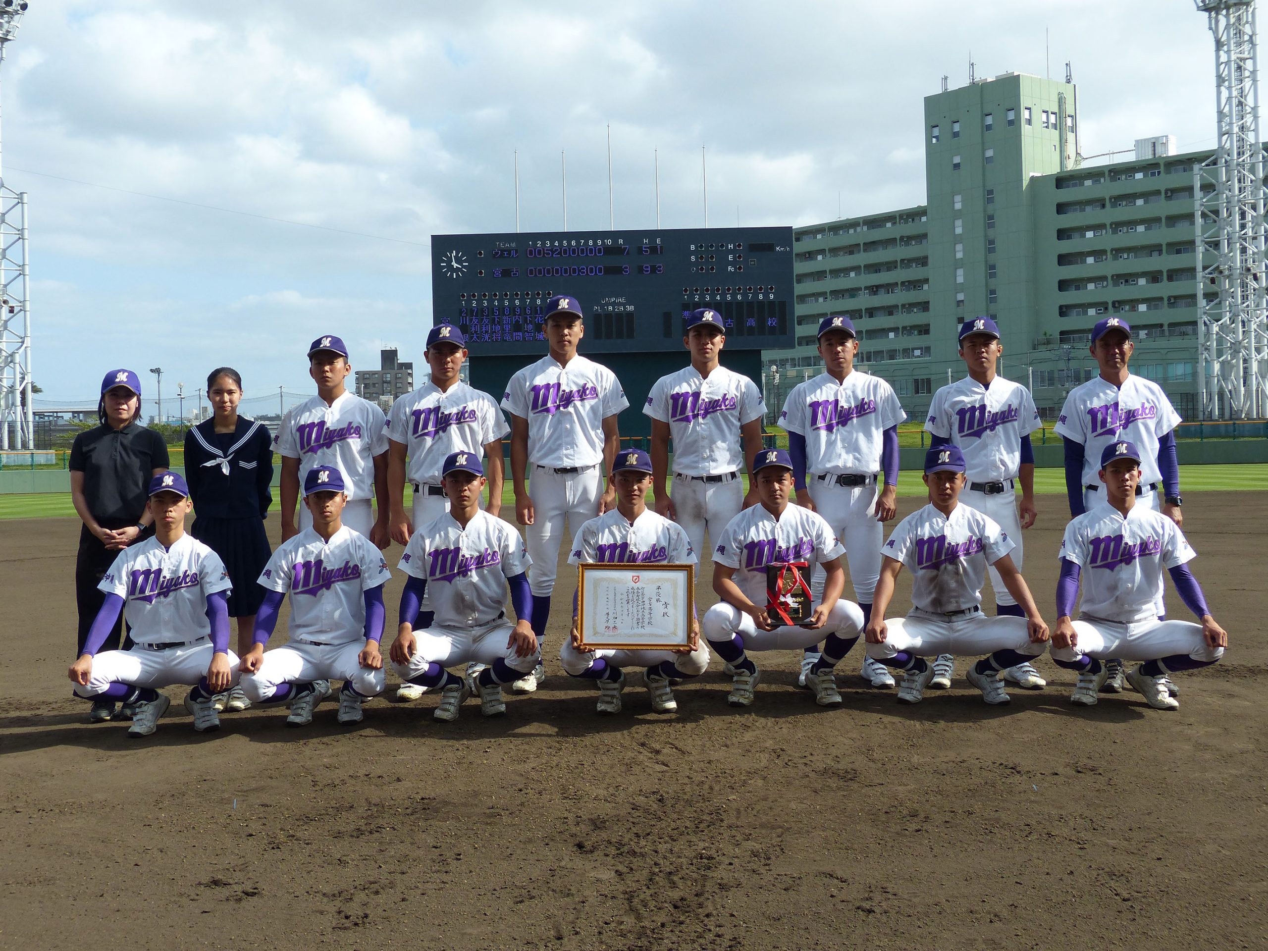 第70回県高校野球春季大会は8日、沖縄セルラースタジアム那覇で決勝戦を行い、宮高が日本ウェルネスと対戦した。惜しくも7-3で敗れたが、準優勝という結果を残した。