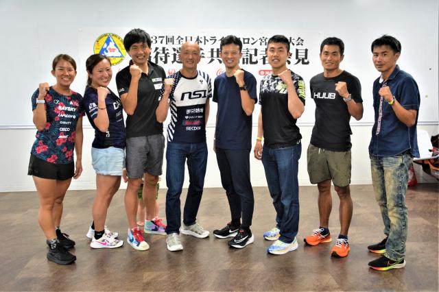 第37回全日本トライアスロン宮古島大会に招待された有力選手の共同記者会見が14日、JTAドーム宮古島で開かれた。第31回、第32回、第35回大会優勝の戸原開人選手、戸原選手の妻で女子優勝を狙う明子選手ら強人が闘志をみなぎらせた。