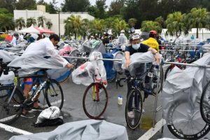 この日はあいにくの雨模様となった。選手たちは忘れ物がないか、何度もチェックした後、雨よけのシートをバイクにかぶせていた。知人と再会を果たし、レースでの健闘を誓い合う姿も見られた。