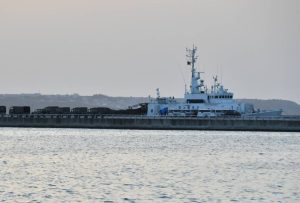 引き上げられた2人を乗せた海上保安庁の巡視船が16日夕、宮古島の平良港に到着。隊員らが慌ただしく動きビニールシートのようなもので目張りした上で、巡視船の中から何かを運び出すような動きを見せた。自衛隊の医官が死亡を確認したという。