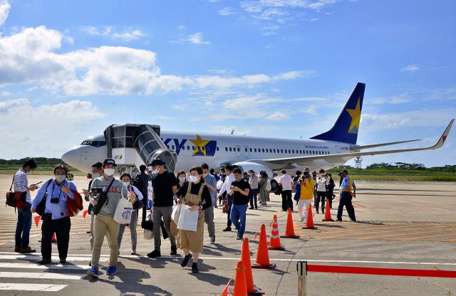 発着枠コンテストのトライアル準備暫定運航として2020年10月から就航がスタートしたスカイマークの羽田-下地島路線。発着枠の期間が2025年3月29日まで継続されることが決まった=2020年10月25日、下地島空港