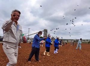 開始式を終えると座喜味会長、砂川所長ら参加者が横一列に並んで歩きながら用意した15㌔の種をまき、緑肥の効果と豊作を期待しながら種をまいた。