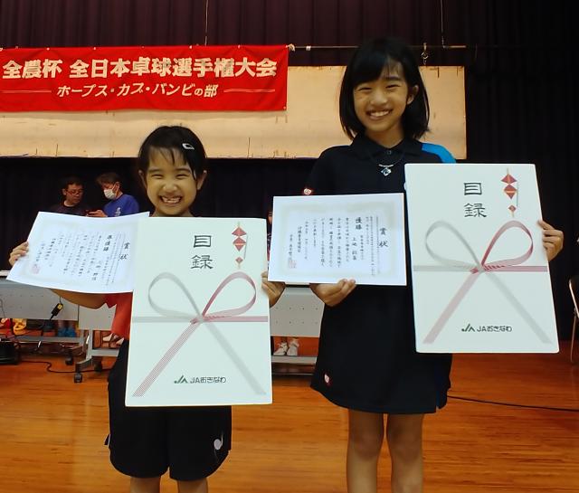 全農杯2023年度全日本卓球選手権大会小学生の部沖縄県予選が22日、那覇市民体育館で行われた。宮古島から出場した東小学校3年の上地彩菜さん(宮古島卓球クラブ)がカブ(小学3~4年)の部で優勝した。また、妹で東小1年の紗佳さん(同)がバンビ(小学1~2年)の部で準優勝し、姉妹で県代表に選出され、全国大会への切符を手にした。