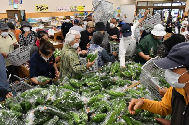 午前9時の開店前には40~50人が集まった。先頭にいた男性は1時間前から並んでいたという。通常価格より安価で、大ぶりのゴーヤー2~3本入り1袋を50円で販売した。