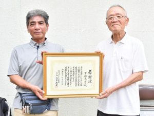 八重山ソフトテニス連盟(浅井康史会長)はこのほど、宮古ソフトテニス連盟顧問の下地忠男さん(82)に先島親善大会を立ち上げたことなどの功績をたたえ感謝状を贈呈した。市パニパニコートで行われた伝達式で、宮古ソフトテニス連盟の仲宗根均会長が手渡し、「60年間にわたり大会が継続している。下地さんのテニス熱は私自身にも大きな刺激になった」と称賛し手渡した。