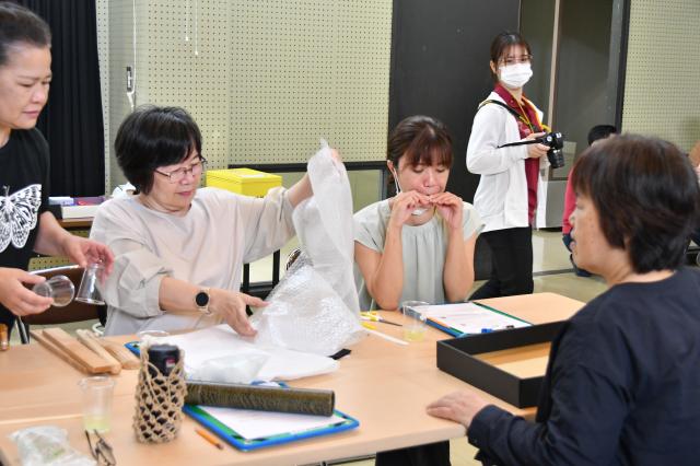 市総合博物館は7日、2023年度の第1回講座を同館で開いた。「収蔵品の音を探そう」をテーマに市民7人が参加。展示物や資料から自分がイメージする音を探し出し、身近な材料を使ってサシバの鳴き声や機織りの音などを表現した。普段は、宮古の歴史、文化は展示物や説明書きなどの資料で鑑賞しているが、音を思い浮かべながら鑑賞する新しい方法に参加者は興味津々の様子だった。