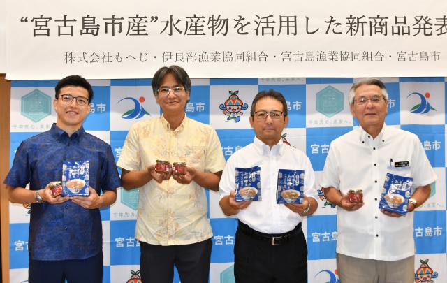 伊良部漁協(伊良波宏紀組合長)のマグロや宮古島漁協(栗山弘嗣組合長)のモズクなど市内の水産物を活用した新商品2品の発表会が9日、市役所で行われた。伊良波組合長、栗山組合長、商品開発を行った「もへじ」の武田翔太郎企画開発部長、座喜味一幸市長が同席し、新商品が市の特産品として地域活性化につながることに期待を示した。商品は全国のカルディコーヒーファームなどで販売が始まるが、島内での販売も予定している。