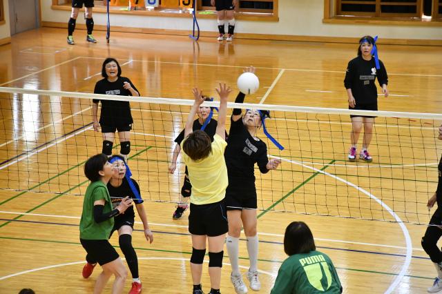 「Volleyball2023ま~みんフェスタ」(主催・全国ママさんバレーボール連盟)が13日、伊良部島小学校・中学校体育館で開催された。全国から120人余のママさんプレーヤーが参加。親善交流試合を行い、会場は明るい笑顔と笑い声であふれていた。