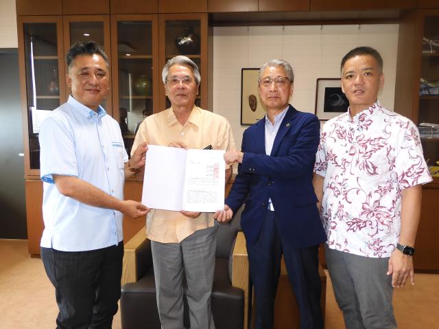 宮古島商工会議所(根路銘康文会頭)、宮古島観光協会(吉井良介会長)、宮古青年会議所(宮古JC、新崎亮太理事長)の3団体は17日、市役所に座喜味一幸市長を訪ね、伊良部地区の野球場・屋内練習場周辺施設のイベント利用と、宮古、下地島両空港の活用について要請した。座喜味市長は「意見交換を行い施策に反映できれば」と述べた。
