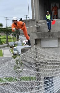宮古島市消防本部(宮國和幸消防長)は23日、同本部で展示訓練を実施した。26日に県消防学校で開かれる第47回県消防救助技術指導会に向け、積み重ねてきた訓練の成果を関係者らに披露した。新型コロナウイルス感染症の影響で、市消防本部の職員が同指導会に参加するのは4年ぶりという。