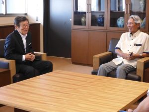 スカイマーク(SKY)の洞駿社長らが26日、市役所に座喜味一幸市長を訪ね、「羽田発着枠政策コンテスト」で同社の羽田-下地島路線が発着枠を獲得したことを改めて報告するとともに市の協力に感謝した。また、7月1日から新たに福岡-下地島線を開設し、8月31日までの2カ月間、1日1往復2便運航させることを説明し、さらなる観光振興に期待と協力を呼び掛けた。