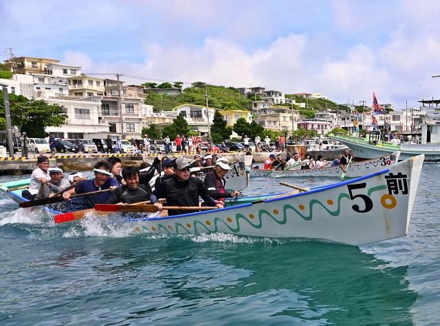 同漁港では、前里添自治会(仲間稱会長)、池間添自治会(上地繁喜会長)それぞれがハーリーを行い熱戦を展開した。
