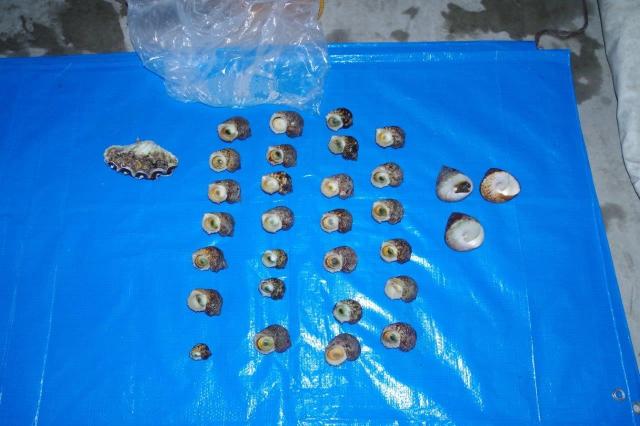 5人は、宮古島および近海離島においてサザエ27個、シャコガイ1個、マガキガイ186個、タコ1匹を採捕。また、そのうち2人は禁止漁具の水中銃を使用して雑魚(合計11匹)を採捕している。