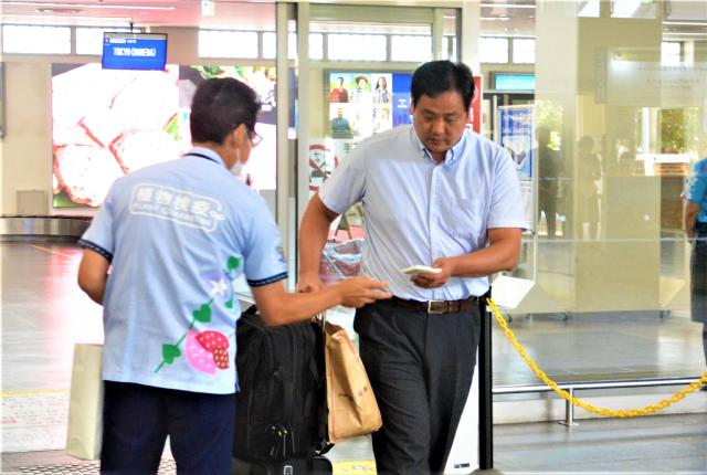 農林水産省那覇植物防疫事務所平良出張所(榎本竜二所長)は12日、宮古空港で紅イモ(サツマイモを含む)やウンチェーバー(エンサイ、空心菜)など県外に持ち出せない植物の周知を図るための広報活動を実施した。榎本所長らがチラシの入ったポケットティッシュを観光客らに配って協力を呼び掛けた。