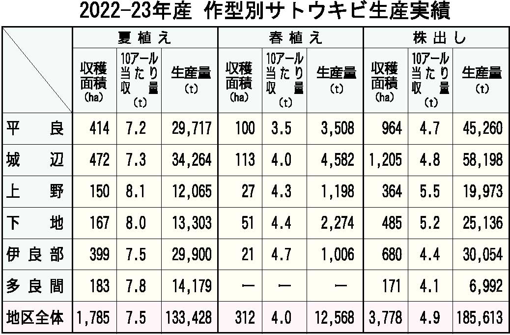 地区別の株出しの平均反収は上野が5・5㌧、下地が5・2㌧、城辺が4・8㌧、平良が4・7㌧、伊良部が4・4㌧、多良間が4・1㌧だった。地域によっては3㌧台の原料区もある。逆に城辺砂川、上野新里・大嶺の原料区は6㌧に迫る反収だった。