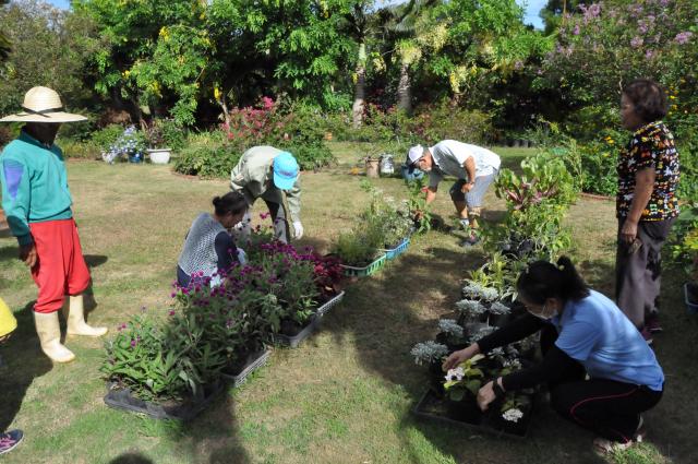 宮古島市市民運動実践協議会グリーン部会(平良耕次郎部会長)は14日、各地域の環境美化活動に役立ててもらおうと道路の里親認定団体など14団体を対象に花苗を無償配布した。平良部会長らが栽培した千日紅や小菊、オオベニゴウカンなど16種類の苗約260鉢がずらりと並び、訪れた団体の担当者が好みの鉢を選んでいた。