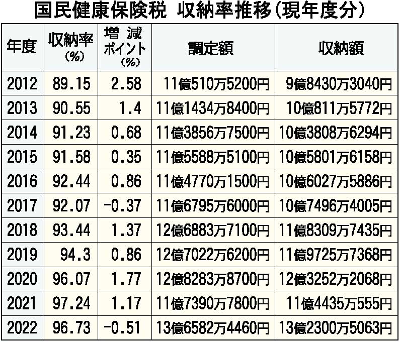 市の国保税現年度分収納額は、2012年度が前年度比3293万円減の9億8430万円と10億円を割り込んだが、13年度以降は10億円台を維持。毎年度、前年度比増を続け、18、19年度には11億円台となり、20年度は12億円台にまで伸びた。しかし21年度は11億4435万円となり前年度を8817万円下回る結果となったが、22年度は再び増加に転じ、13億2300万円となった。