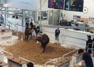 成牛を含めた上場頭数は352頭で347頭が取り引きされた。成牛を含めた1頭平均価格は42万1427円。去勢が51万9423円、雌が30万37円。全体の販売額は1億4623万5100円となった。