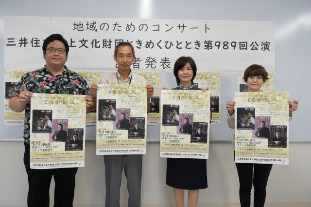 市教育員会(大城裕子教育長)は19日、市役所で会見し、9月10日にマティダ市民劇場で三井住友海上文化財団ときめくひととき第989回公演を開催すると発表した。同財団と県、市教委の共催。「ホルン・ヴァイオリン・ピアノの融合 室内楽の愉しみ」と題し、第一線で活躍する奏者がモーツアルトなどを奏でる。奏者はホルンが福川伸陽さん、バイオリンが長原幸太さん、ピアノは内門卓也さん。午後2時30分開場、同3時開演。チケットはきょうから発売開始。